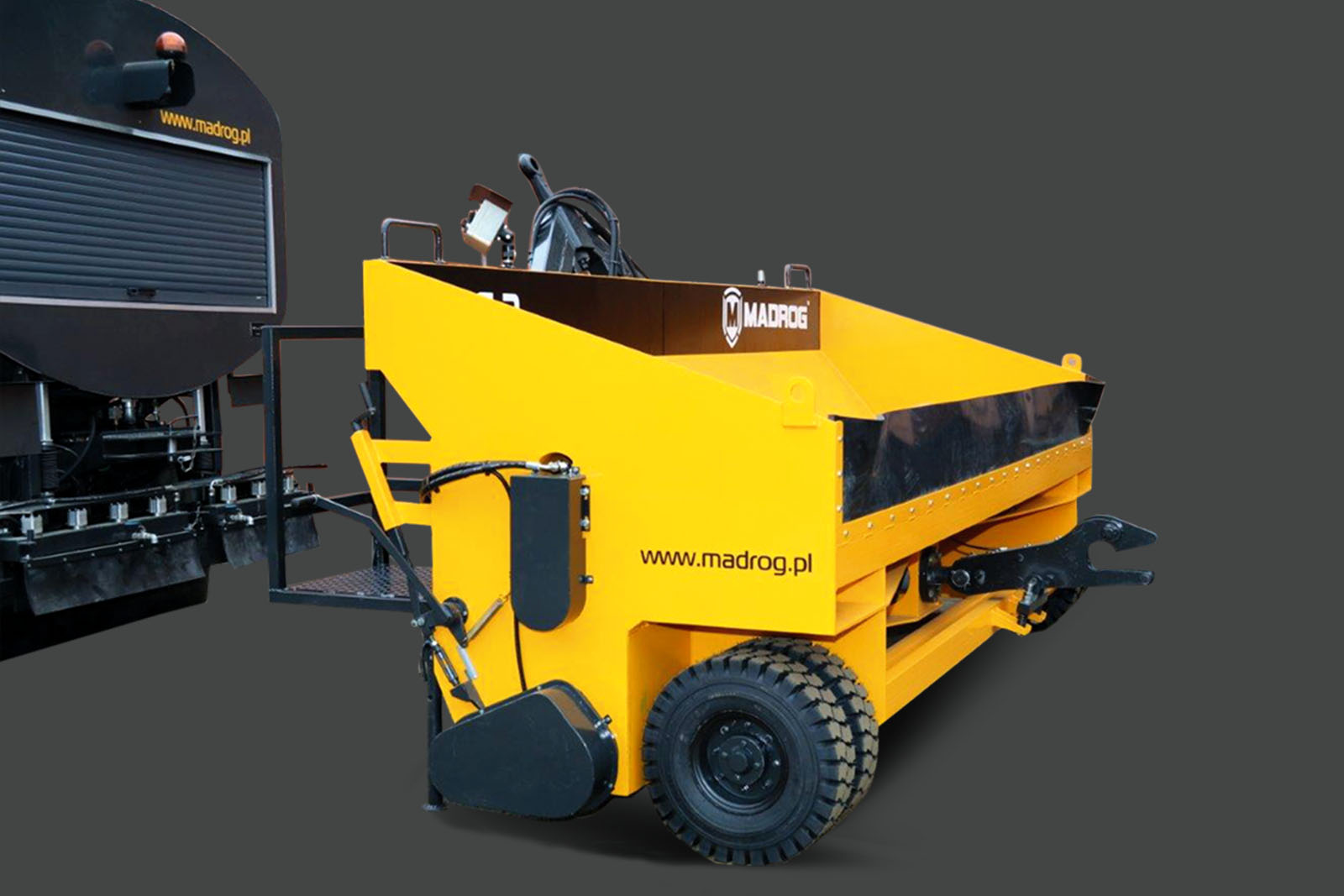 Durante su funcionamiento, el esparcidor se conecta al aspersor mediante un enganche y es arrastrado por este. El aspersor pulveriza con los parámetros adecuados y esparce la gravilla sobre la superficie previamente rociada. El material (gravilla mineral) se alimenta desde el camión volquete al esparcidor y se esparce mediante un transportador de tornillo. Posteriormente, pasa a un rodillo ranurado y, desde allí, a través de compuertas de 0,25 m de ancho, a la carretera, cubriendo la capa de emulsión.